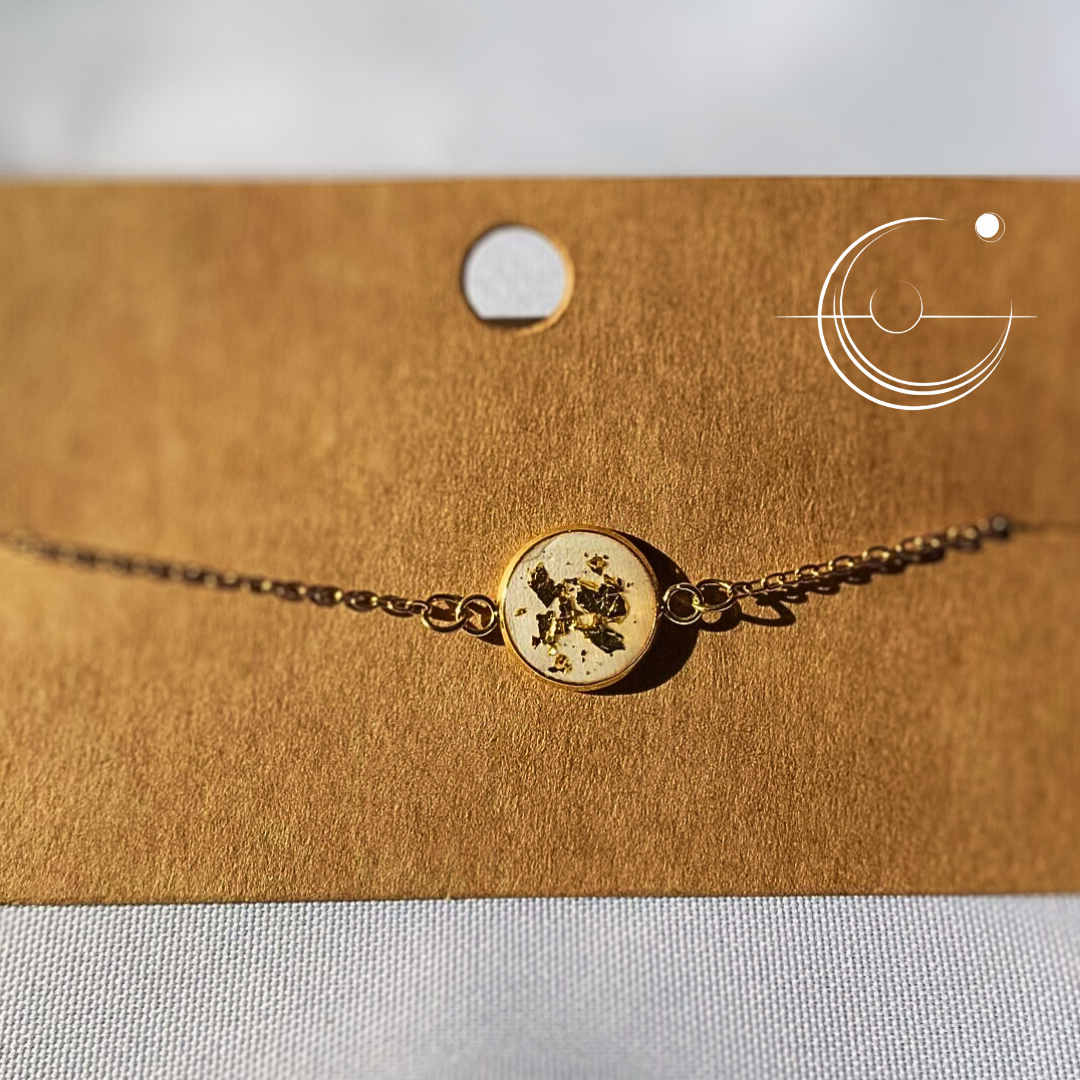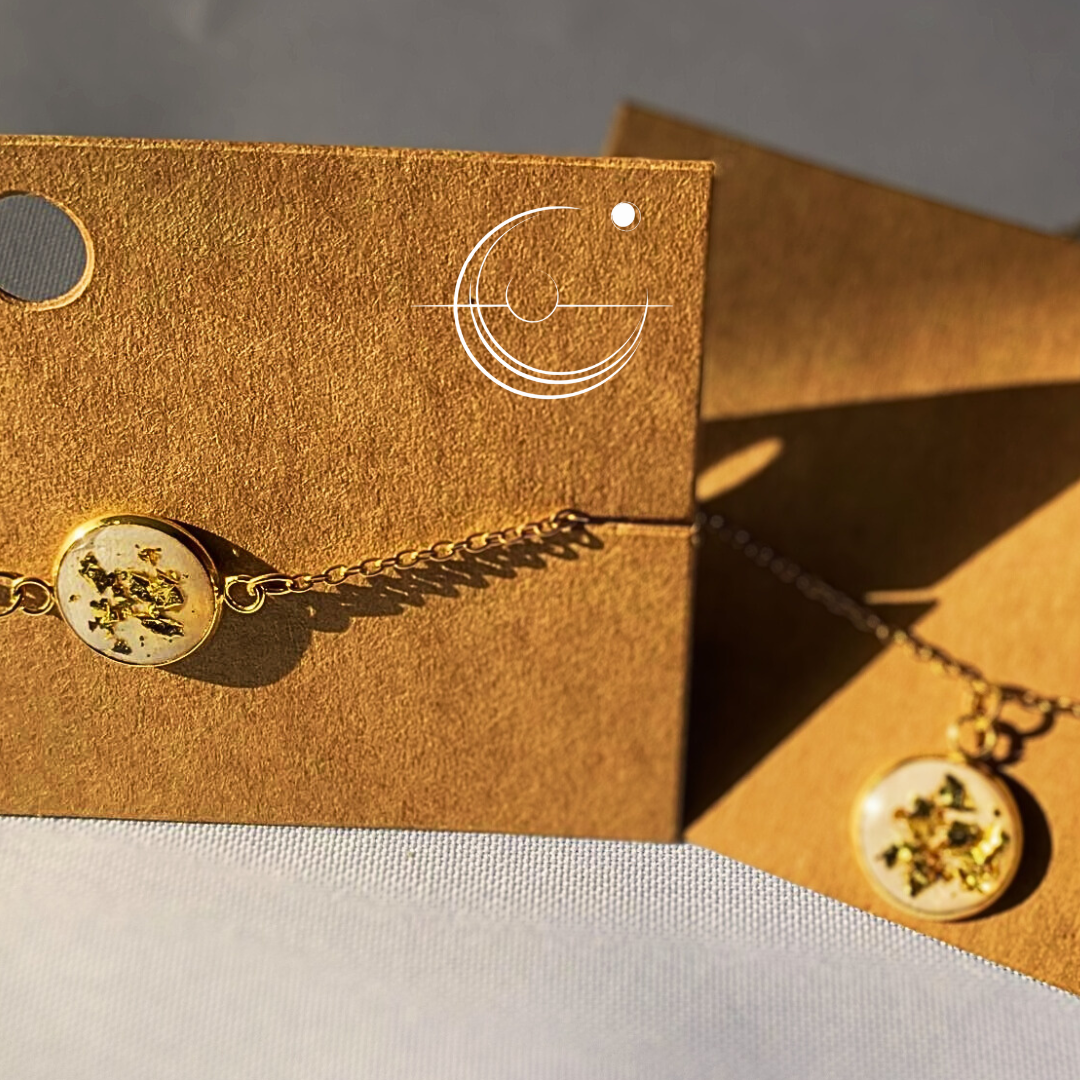Collier Blanc Or en argile pigmentée avec incrustation de feuilles d’or, résinées à la main et parure en acier inoxydable dorée.