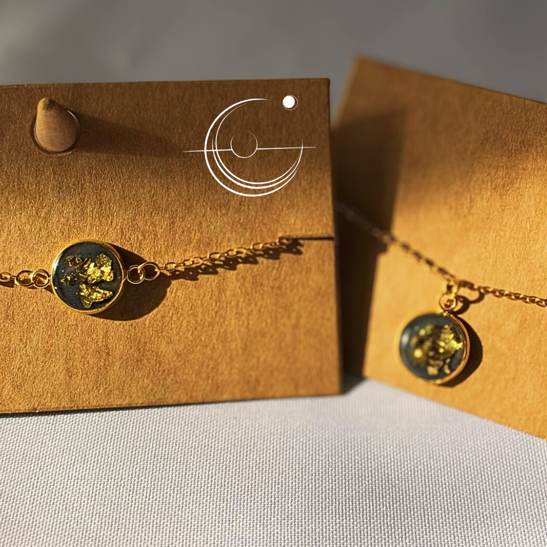 Collier Noir Or en argile pigmentée avec incrustation de feuilles d’or, résinées à la main et parure en acier inoxydable dorée.