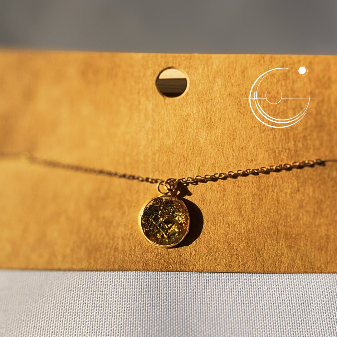 Collier Or en argile pigmentée avec incrustation de feuilles d’or, résinées à la main et parure en acier inoxydable dorée.