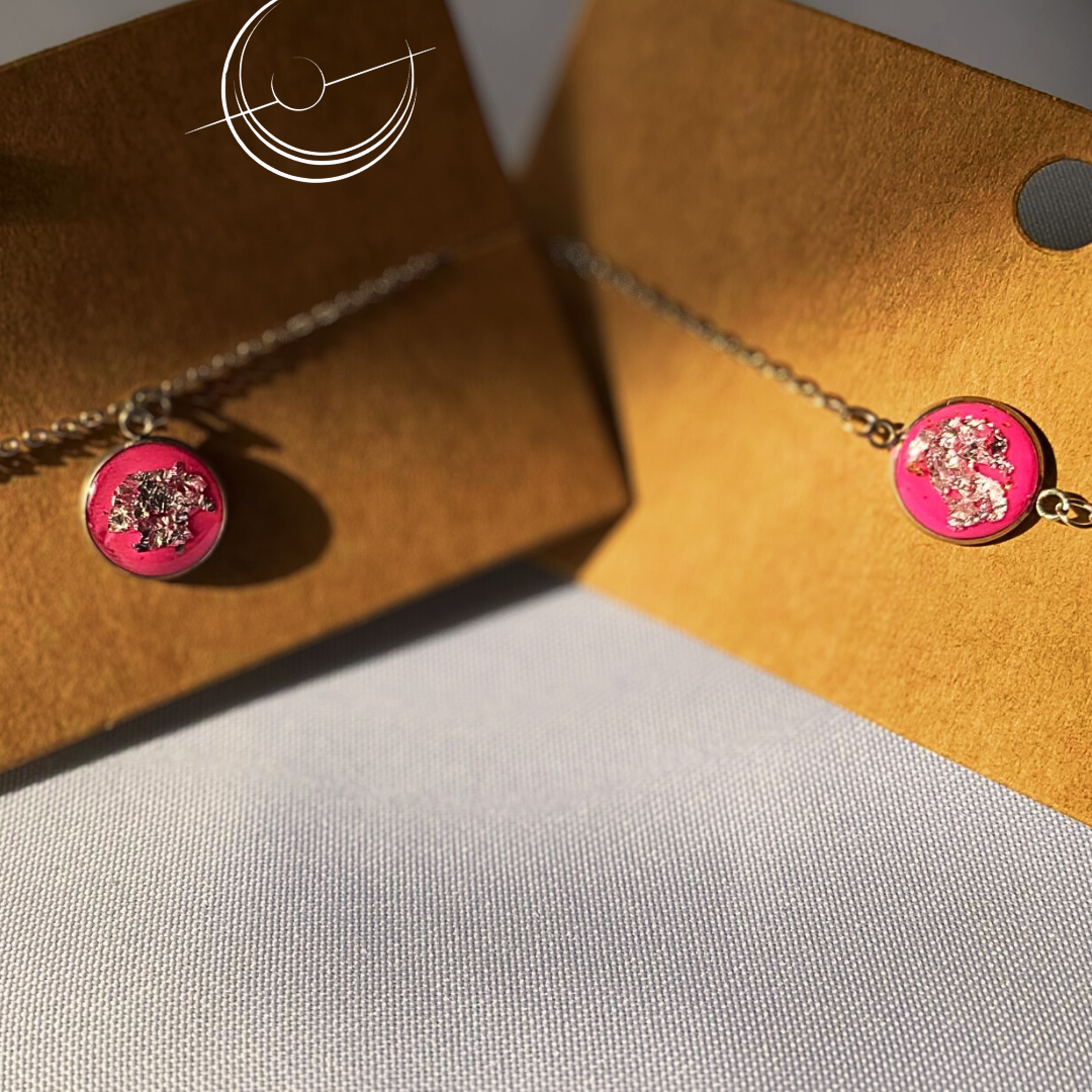 Collier Rose Argent en argile pigmentée avec incrustation de feuilles d’argent, résinées à la main et parure en acier inoxydable argentée.