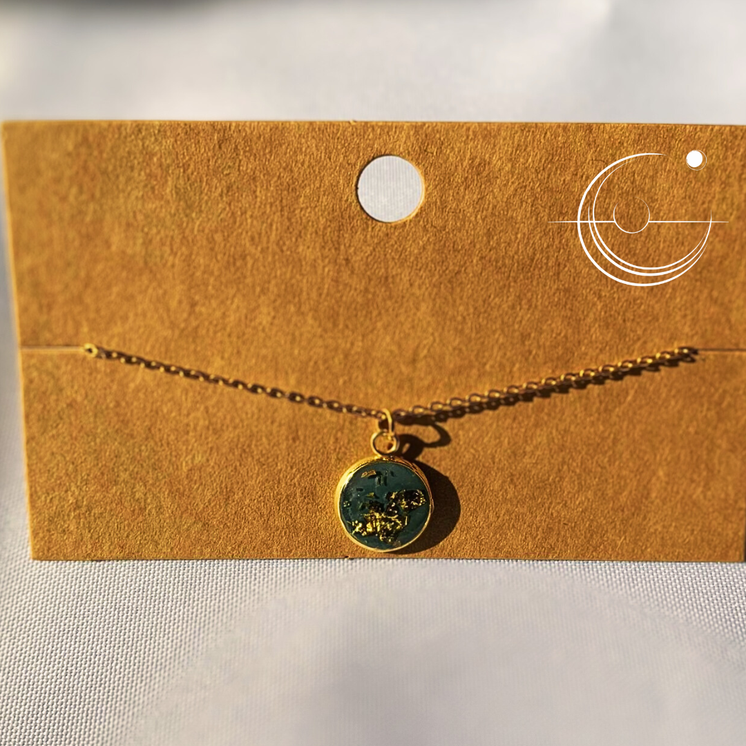 Collier Vert Bouteille Or en argile pigmentée avec incrustation de feuilles d’or, résinées à la main et parure en acier inoxydable dorée.